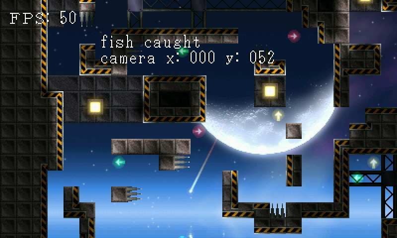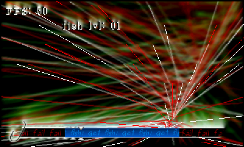 I started to decide how the fishing minigame will play. Throughout the world, there will be tiles the player can stand on marked as 'fishable', and the default action for the attack button will switch from 'attack' to 'fish' if there are no monsters within a certain radius. Once the player has decided to fish, I'll blur the background and bring up the bar graph (see attached screenshot). The reticle will bounce from left to right and back again, and the player has to use the attack button again to stop it in the 'get fish!' area. After that, I'll internally do some kind of dice roll to determine what fish they'll get and what size it'll be. (Ignore the crazy lines in the background, I just wanted something back there that wasted some CPU time to check performance.)