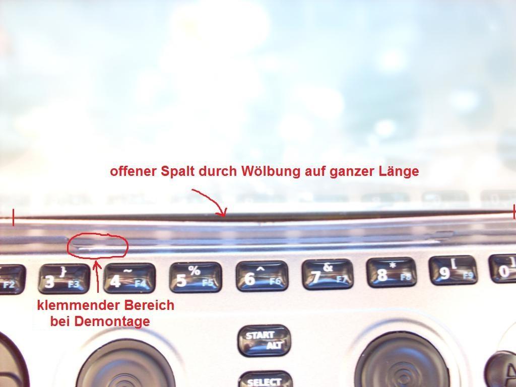 Aber mich stört, daß sich der LCD-Rahmen nach aussen biegt, es ist wohl unten am Schanier etwas zu breit und bei der Montage sozusagen 'eingepresst' worden, wodurch diese Wölbung wohl enstanden ist.