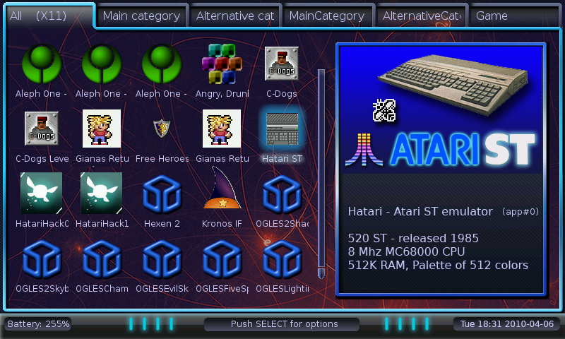 NOTE 6: If you have non-empty directories in /media (default file browser location, see mmenu.conf to alter it) it will show tabs for those (by default, you can configurfe it to not do that, or to look elsehweere, or etc etc.); in this case, using the file browser, it can run stuff, but I dont' see much point in you using 800x480 program on your desktop linux machine to run xeyes