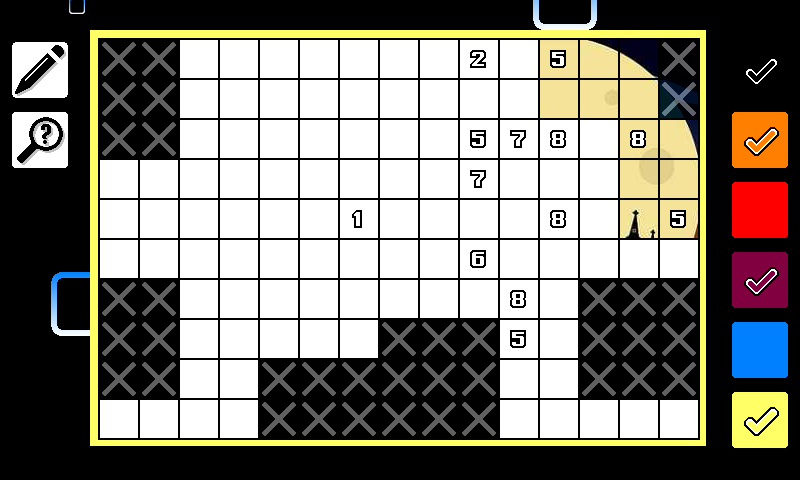 If a move is available (either a picture piece needs to be placed or a cross), then a tick appears in the colour palette.