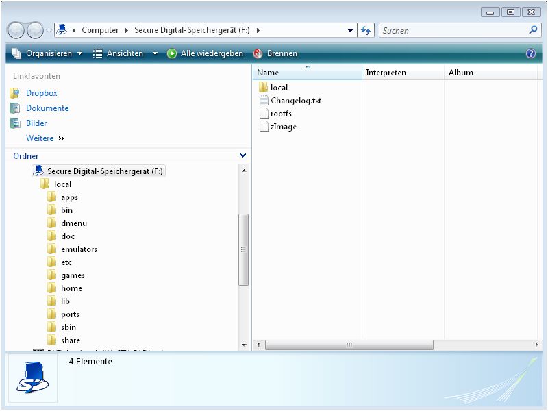3. Ihr habt nun einen Ordner "local" , zImage-ILI9331, zImage-ILI9325, rootfs und Changelog.txt darauf