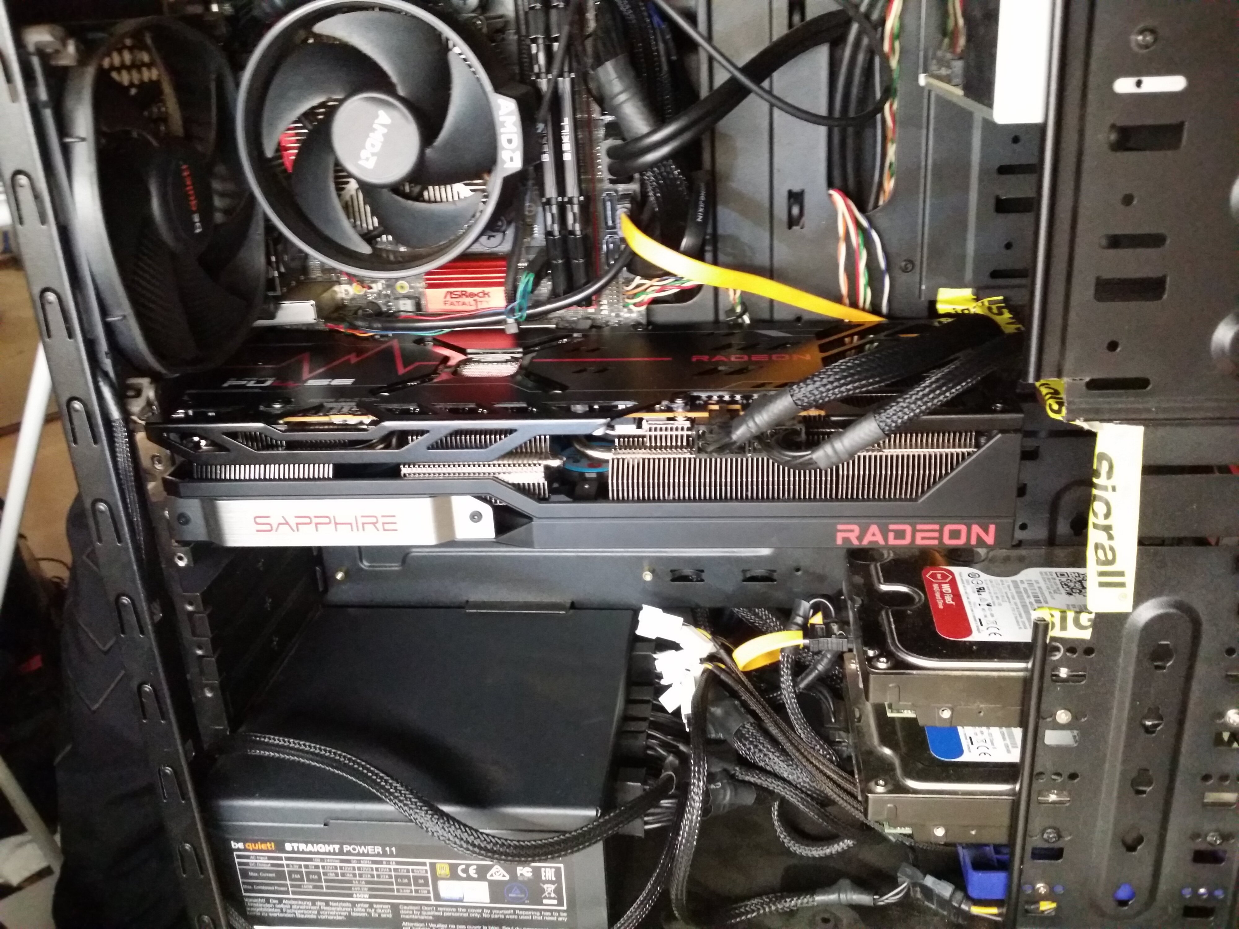 Look how I massacred my boy... had to take the rotary tool to the case to fit this beast inside. The proportion of the card and the mini ITX board is kinda funny. Used a whole can of cleaning spray to get the filth out. Then took the front panel off and cleaned it whole under the shower. Had to deep clean the bath tub, myself and hoover half of my place after that. How this box breathed is a mystery to me ^^. Got a 3700X off eBay for 120 €, that'll go in tonight.