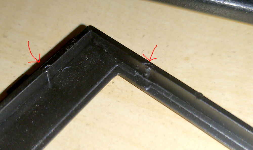 Unfortunately, these pegs cause an issue during assembly: As the frame is put on top of the LCD, these small pegs can easily CRACK the touchscreen as force is applied at that one point... even though the surroundings would fit.