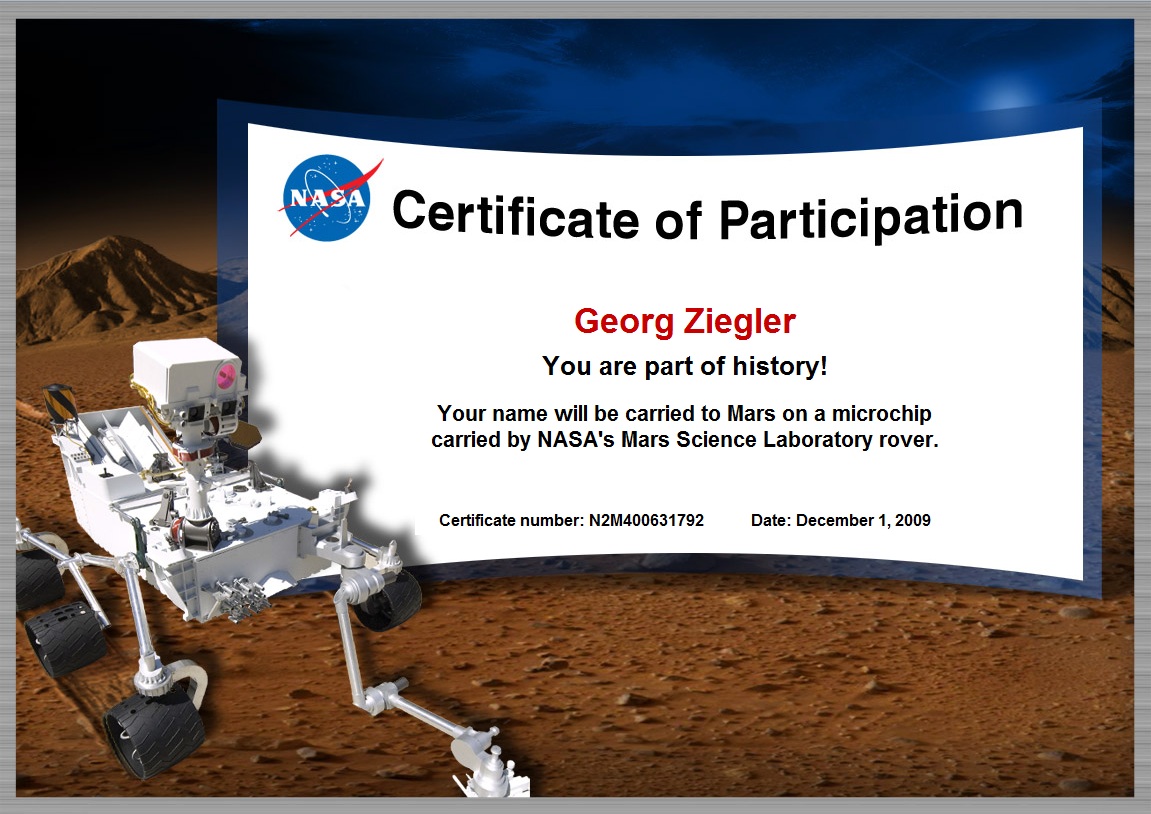 Das ist eine Seite der NASA. Man kann seinen Namen eintragen, der dann auf einem Mikrochip 2011 mit dem neuen NASA Rover zum Mars geschickt wird! Am Schluss bekommt man sogar ein Zertifikat generiert mit Certificate Number :juhu: